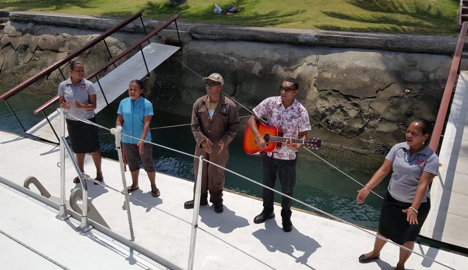 Our days will start very early and will end almost immediately after dinner about the same time the sun goes down. No late nights for this gal. Tomorrow we head out on our 1700 nautical mile, 12+/- day crossing to Kosrae, Micronesia, we will lose sight of land around 6 pm. Here is a shot of the crew with Sam the taxi driver, he was my personal shopper, schlepper, tour guide and driver as well as an all around cool guy.